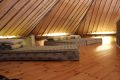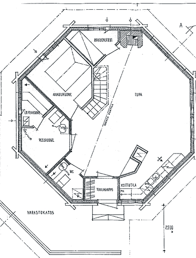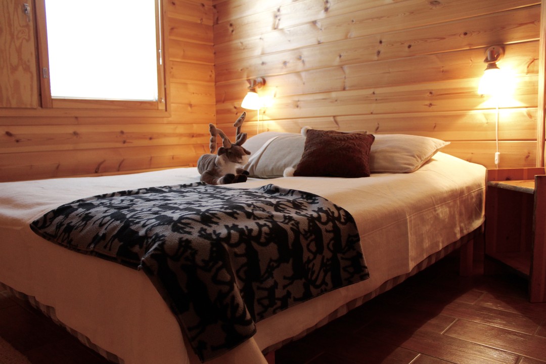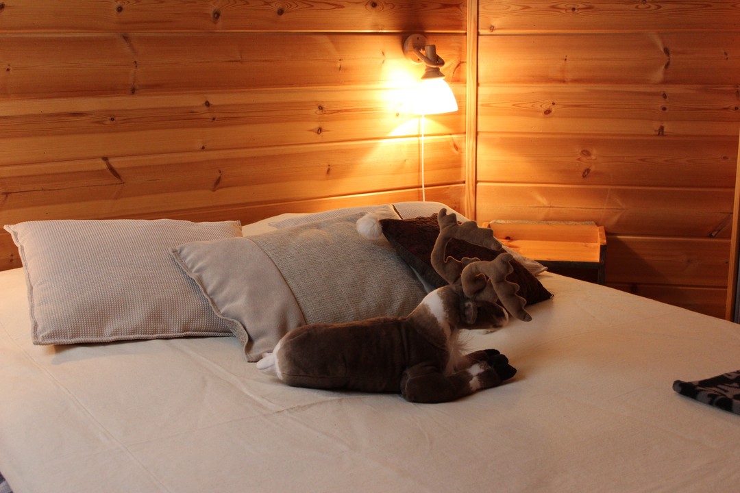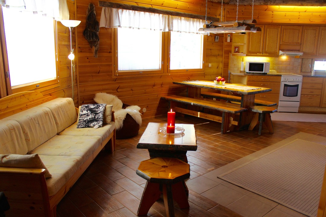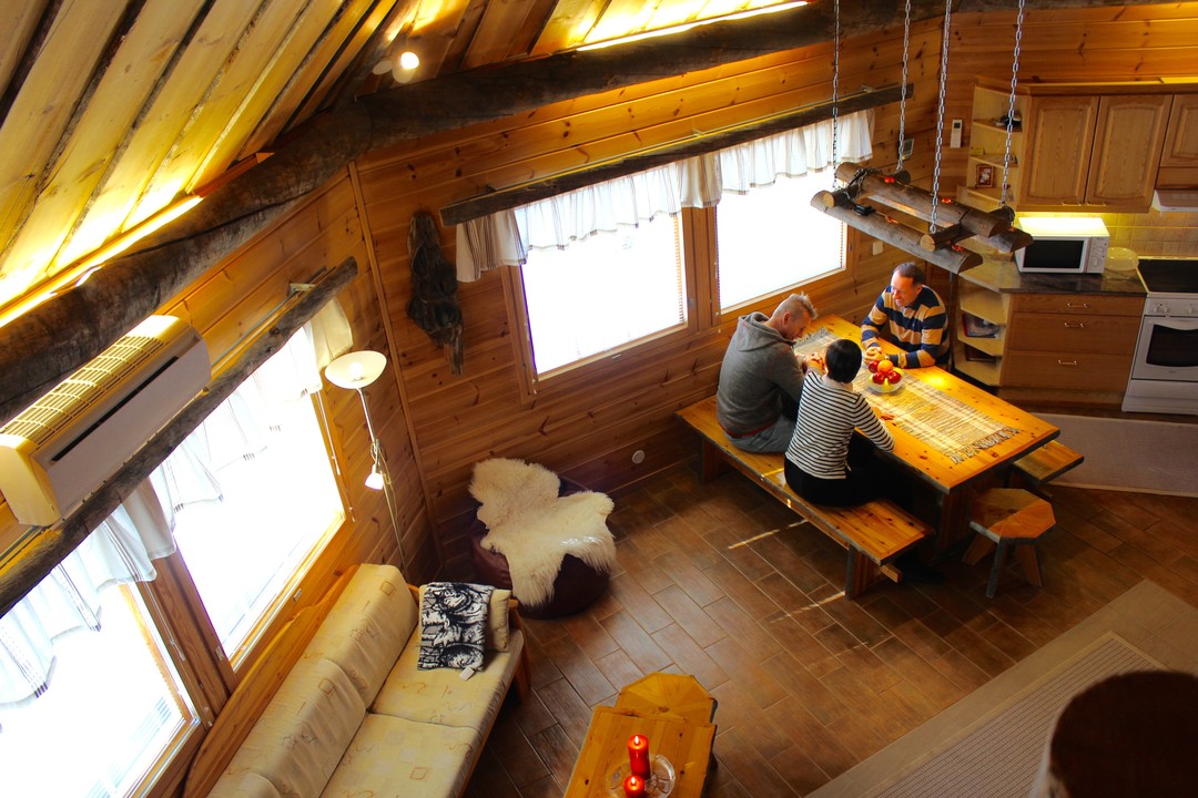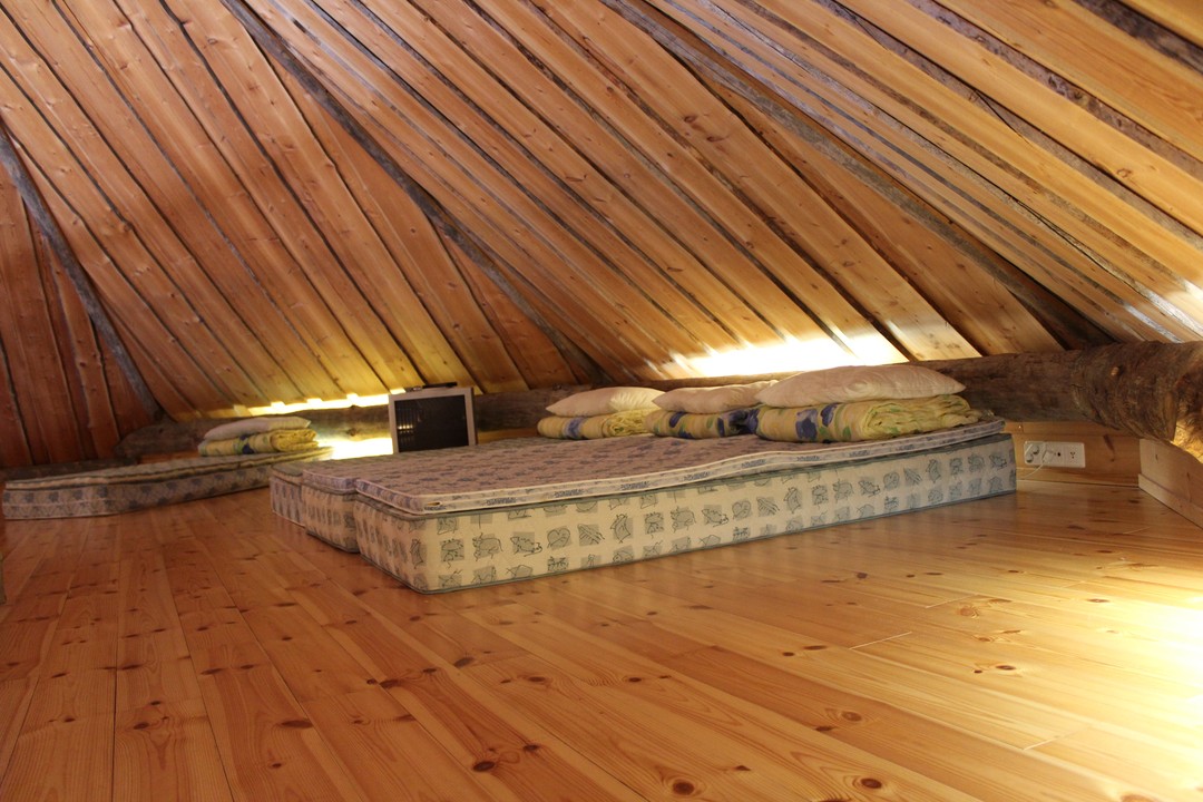 Kaksi makuuhuonetta alakerrassa, toisessa kahden hengen runkopatjasänky. Olohuoneessa levitettävä vuodesohva. Lisäksi erittäin tilava seisontakorkuinen parvi, jossa neljä lisävuodetta.